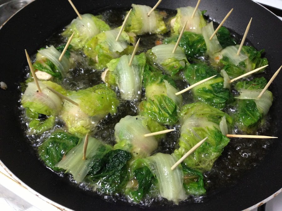 Cuando tengamos todos los paquetes o saquitos hechos los salpimentamos, ponemos una sartén con suficiente aceite para que los saquitos queden cubiertos hasta almenos la mitad y lo calentamos.