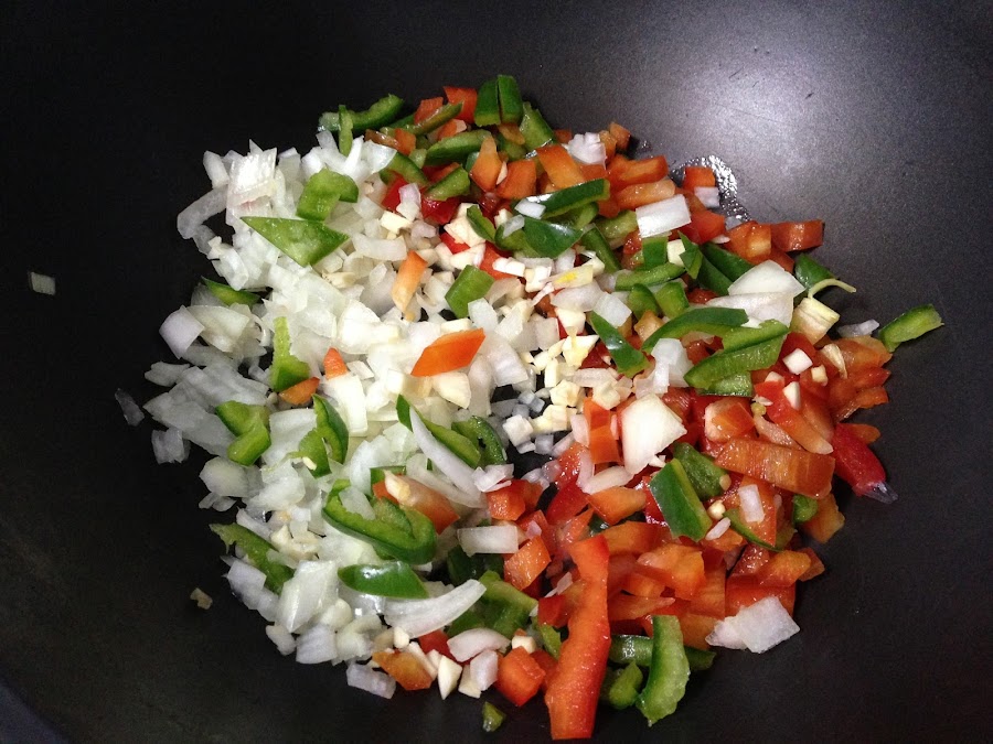 Cortamos en dados o trozos bastante pequeños el medio pimiento rojo, el medio pimiento verde, la cebolla y el ajo.