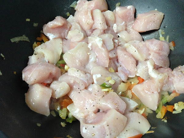 Una vez pochada podremos añadirle los trozos de pechuga que hemos cortado y aderezado y lo removemos todo para se vayan mezclando los sabores.