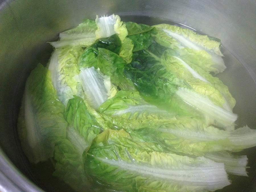 Una vez que el agua hierva meteremos en ella las hojas de un cogollo o corazón de lechuga, previamente lavadas. Le añadiremos dos puñados de sal y lo tendremos hirviendo 1 minuto o 1 minutos y medio.