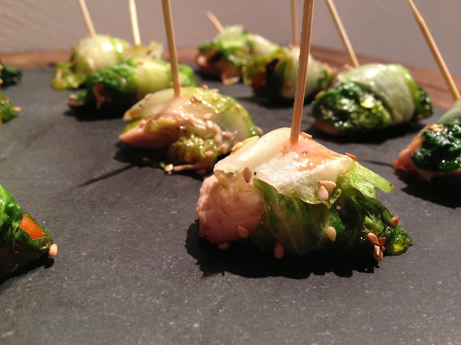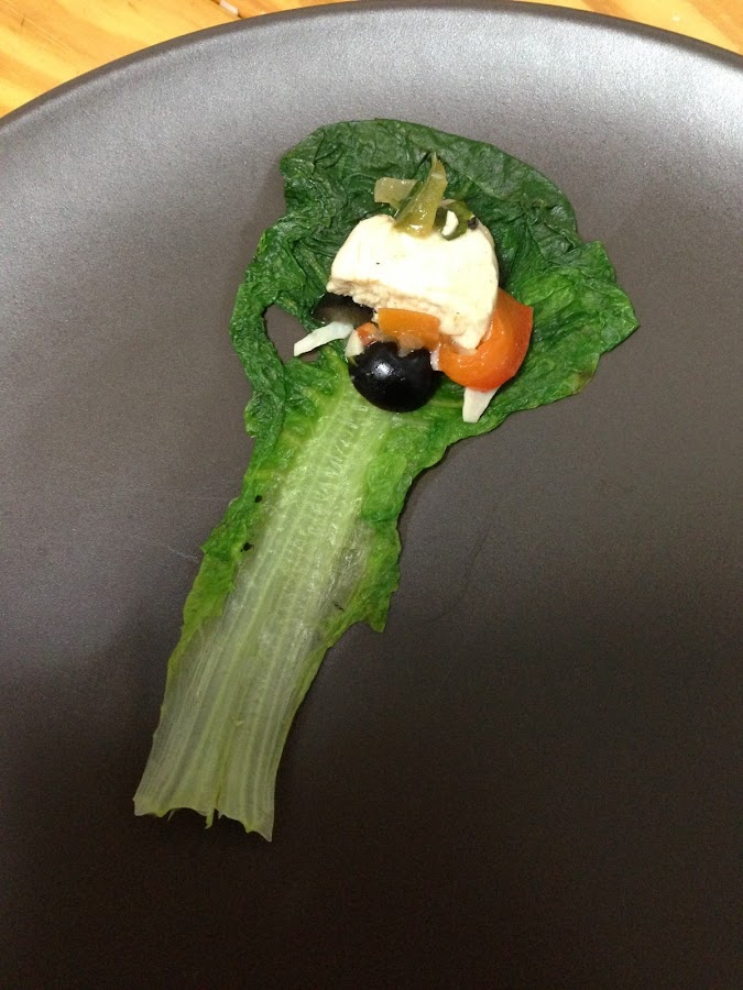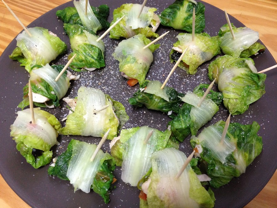 Mientras el pimiento y la cebolla se van haciendo podemos cortar el pollo en dados. Los trozos deben ser pequeños, ya que después deberemos enrollarlos en una hoja de lechuga pequeña, y más o menos todos del mismo tamaño. Los salpimentamos y esperamos que la verdura esté pochada.