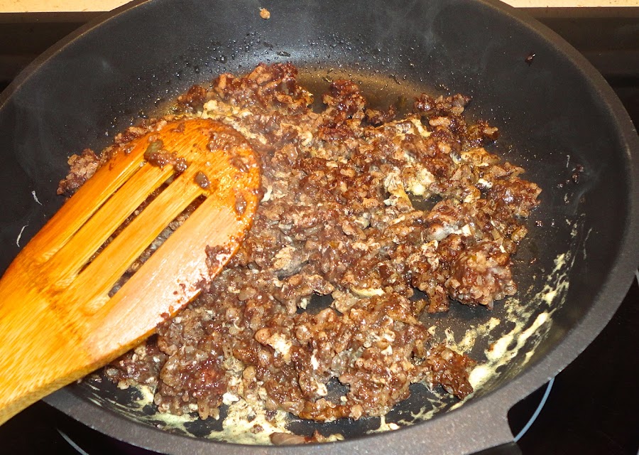 Ponemos nuestra morcilla con el huevo batido y la hacemos un poco, no la hacemos demasiado porque luego la vamos a meter al horno y sino se nos quedaría muy seca.