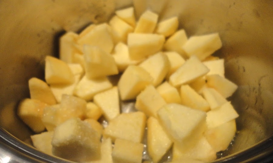 Cortamos en taquitos la manzana pelada y descorazonada, ponemos un poco de azúcar al gusto y un chorrito de agua, hacemos a fuego medio hasta que se ablande.