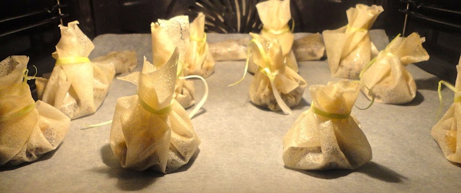 Cerramos con el hilo de puerro en forma de bolsa y metemos al horno a 180º unos 10 minutos (hasta que la masa se ponga un poco tostada)
