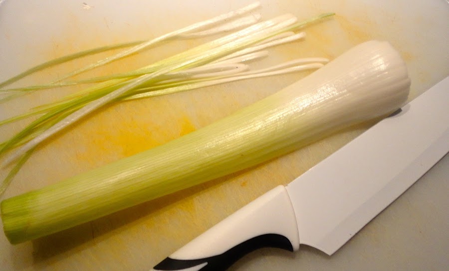 En primer lugar vamos a cortar en tiras finas la cáscara del puerro que nos servirá como hilo para nuestros saquitos.