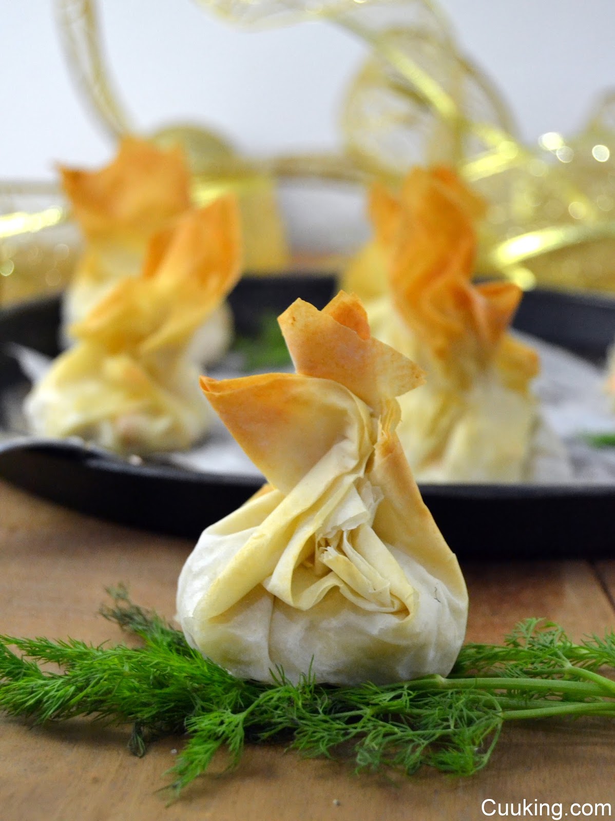 3.- Colocamos en el centro de cada cuadrado una cucharadita de la mezcla de queso y salmón. Cogemos las esquinas y las juntamos formando los saquitos. Atamos con hilo de bramante.