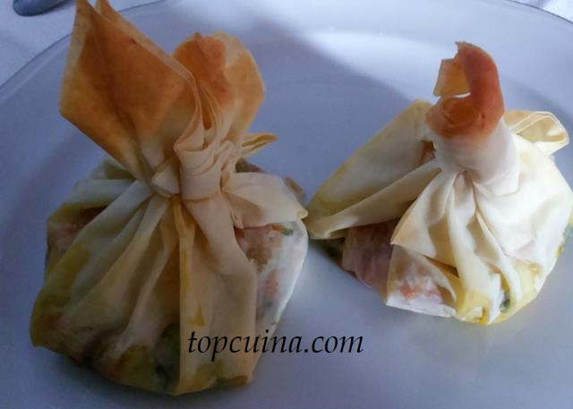 Colocamos una oblea de pasta brick encima de la encimera. Echamos una cuchara de la mezcla anterior en el centro y formamos un saquito, cerrando la oblea y atándola con un trozo de cordel de cocina.