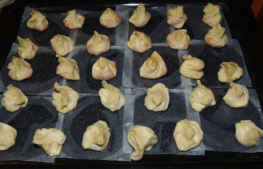 Se precalienta el horno y en una bandeja se van poniendo los papeles que van con las obleas y sobre ellos, los saquitos.