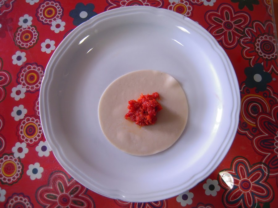 Se ponen las obleas una a una en un plato y en el centro se añade un poco de sobrasada.