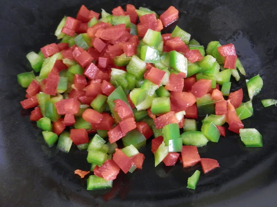 Pela y pica la cebolla y el pimiento en cuadritos pequeños.