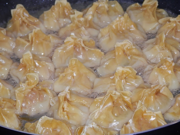 Cuando esté un poco dorado, añade agua hasta la mitad de los saquitos y tapa la sartén.