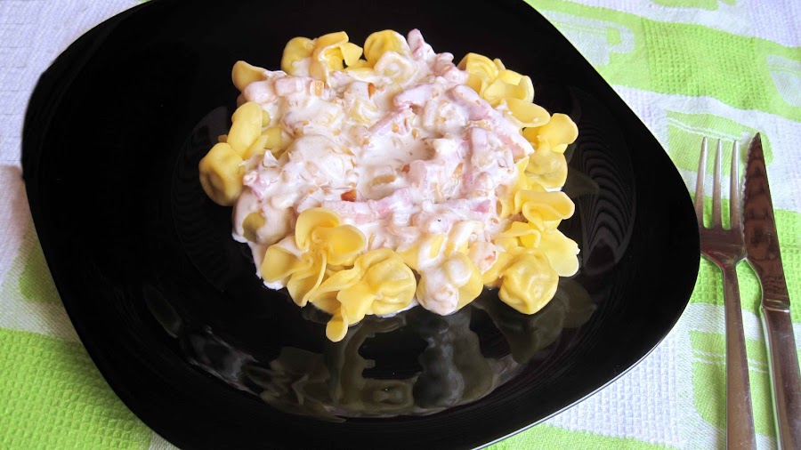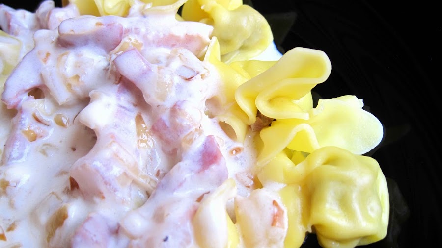 y como en casa la salsa que más les gusta para la pasta es la carbonara, no quise arriesgar con probar a hacer alguna nueva y fui a lo seguro, y no me equivoque, les han encantado, ya no solo por la salsa si no por el relleno que llevan estos saquitos.