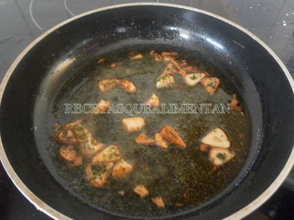 Una vez que toman un color tostado añadimos el perejil picado fino y removemos un poco, retiramos la sartén del fuego y vertemos el zumo de un limón recién exprimido.