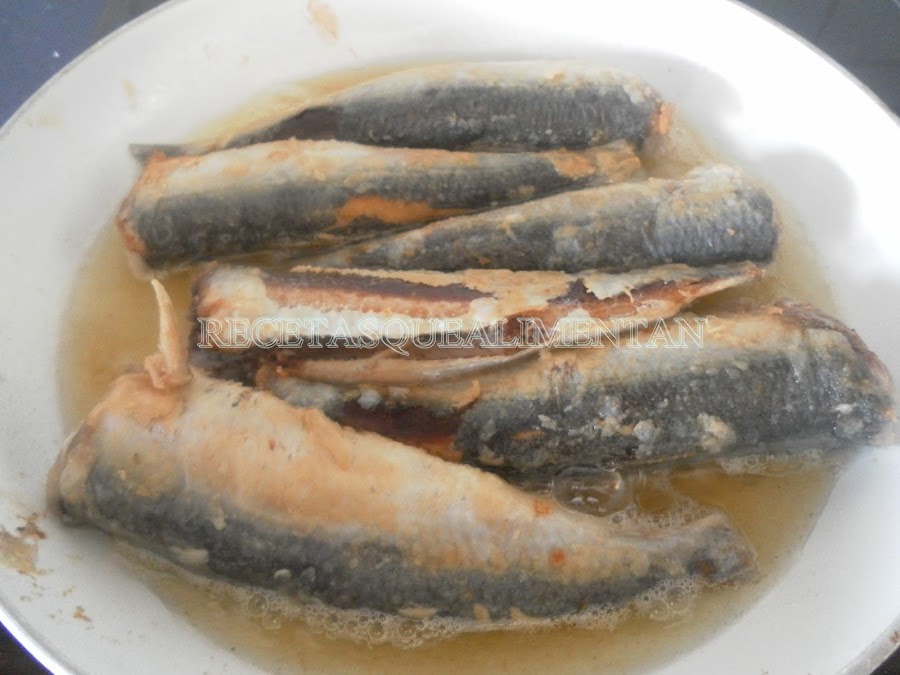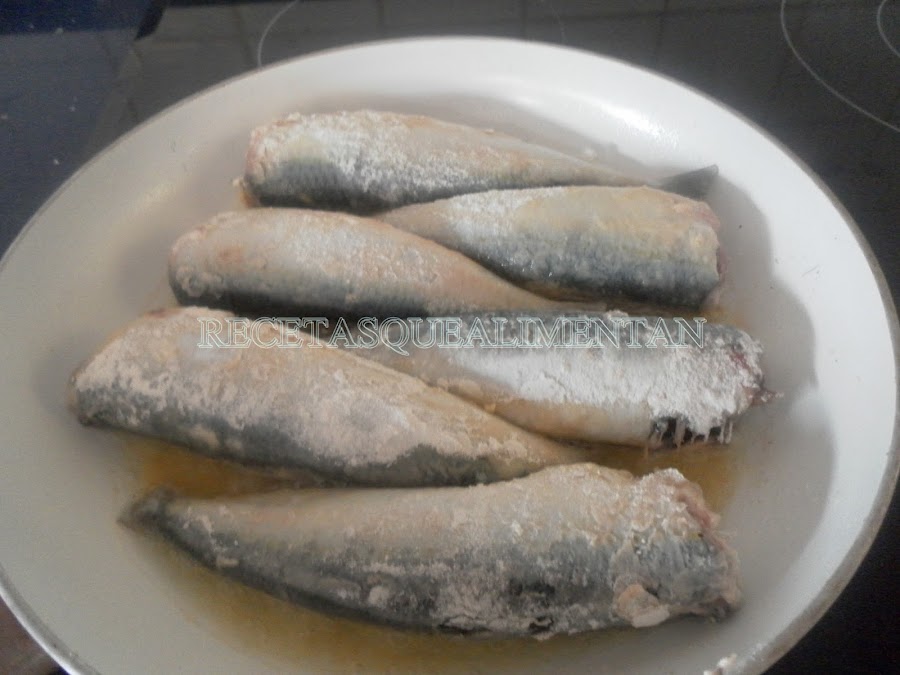 Mientras, pasamos las sardinas por harina y las freímos en otra sartén con aceite de oliva.