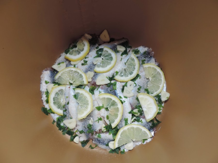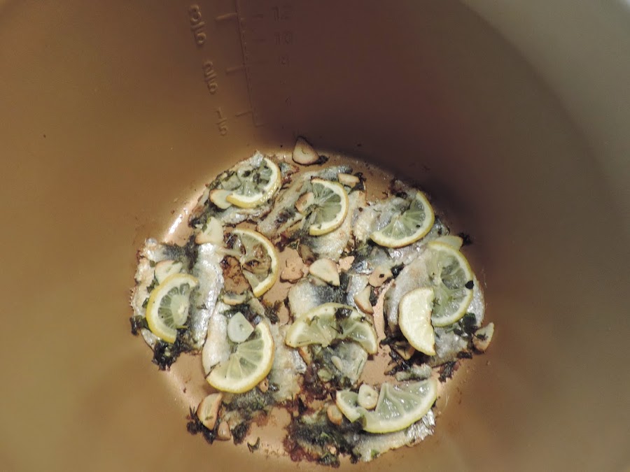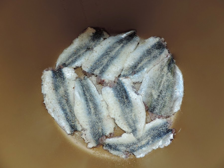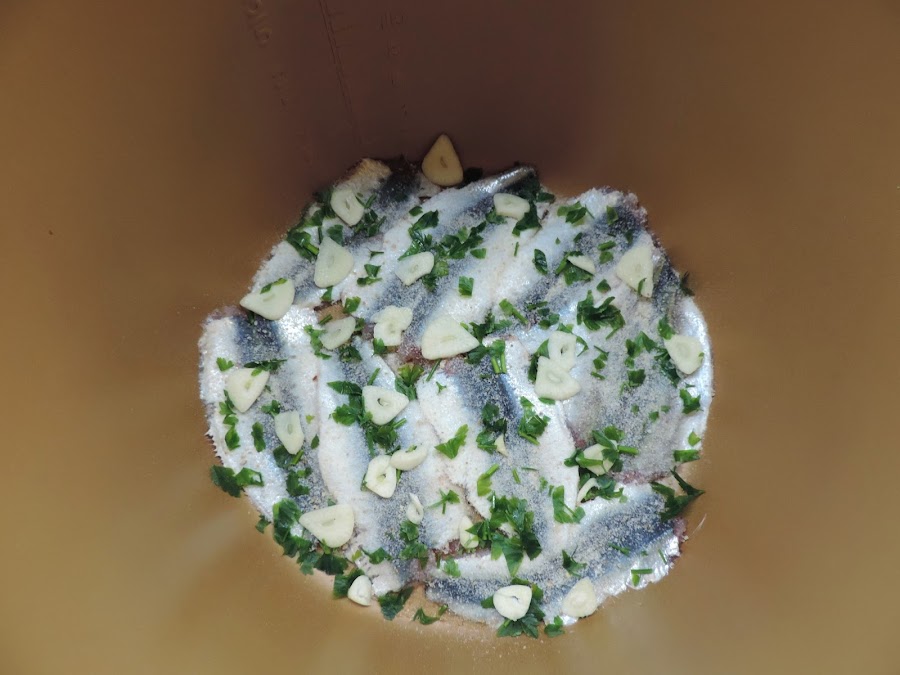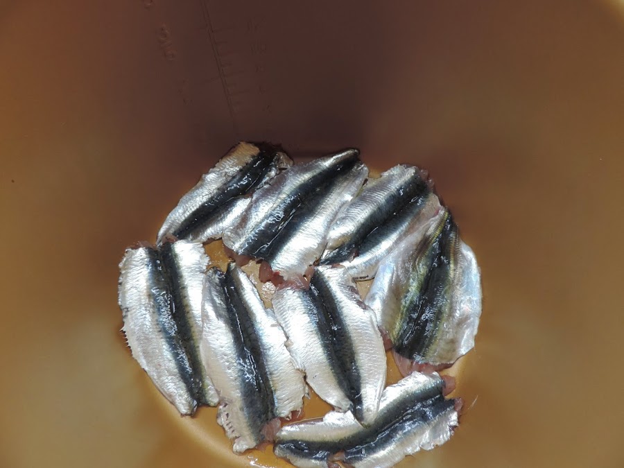Poner las sardinas en la cubeta de la olla hacia abajo.