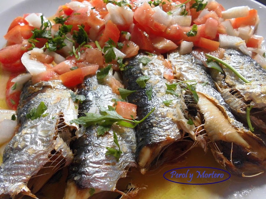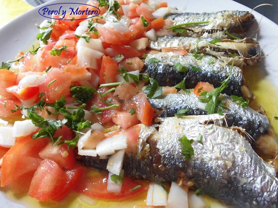 Dicen que los meses que no llevan "R" son los idóneos para consumir sardinas. Junio no la lleva, y hoy en la pescadería las tenías bien gordas y llenitas, frescas frescas. Así que ese ha sido hoy nuestro almuerzo: Sardinas asadas en el horno y cubiertas de un aliño de picadillo. Deliciosas!!