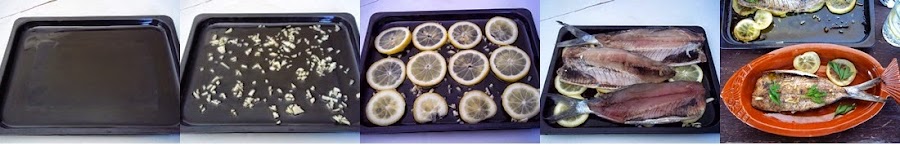 Tan sencillo como poner aceite en una bandeja apta para horno, añadir los ajos bien picaditos, a continuación colocamos las rodajas de limón, y sobre éstas el pescado. Terminamos con un hilo de aceite sobre las sardinas, una poca de sal marina y pizca de pimienta negra molida.