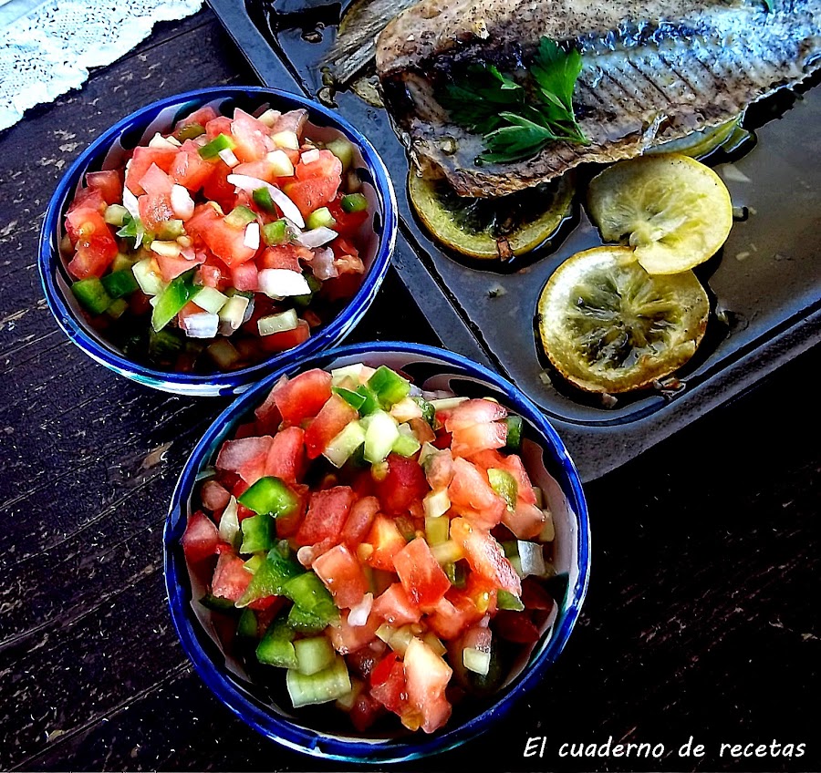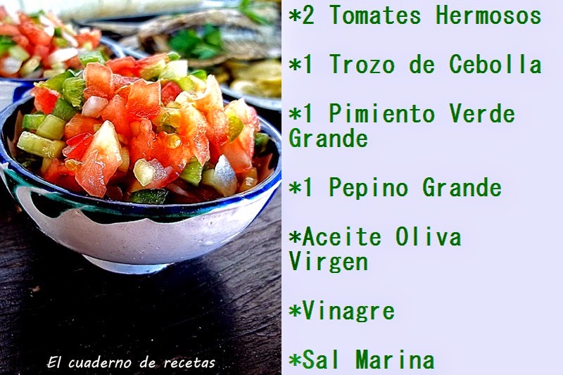 No es más que una reunión de tomates, cebollas, pepinos y pimientos, en trozos muy pequeños, con su buen aliño de aceite virgen, sal y vinagre.