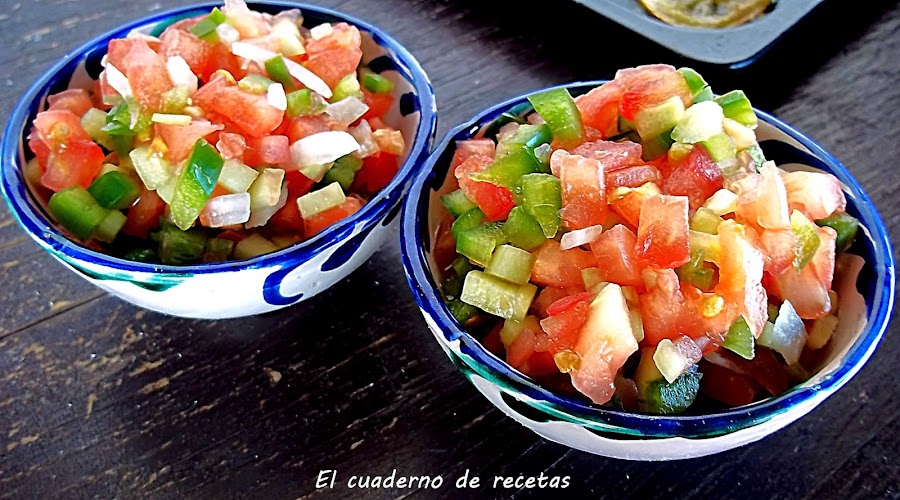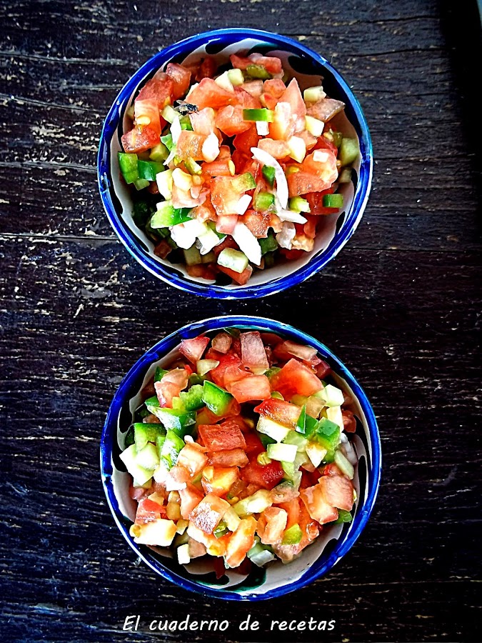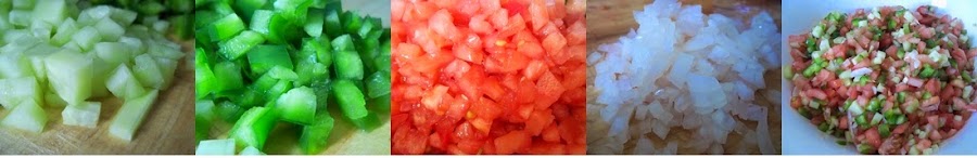 Casi sobran las explicaciones, pero bueno, por dejarlo todo bien claro. Cortamos las verduras muy, muy pequeñas y las mezclamos en un cuenco. Lo llevamos a la nevera hasta el momento de servir.