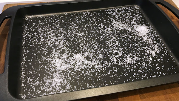 Tengo el horno (el grill) encendido a máxima temperatura. Pongo sal marina sobre la bandeja de horno.