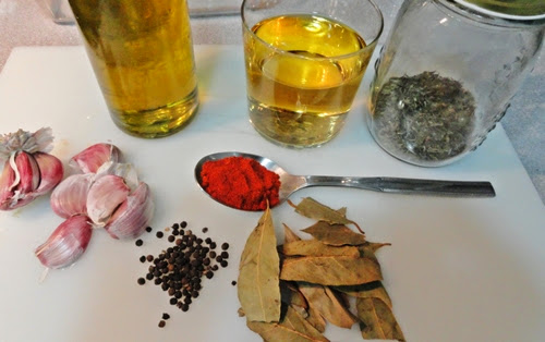 En el mismo aceite que hemos utilizado (previo colado de restos de harina) o bien empezando con aceite limpio, añadir los ajos enteros (yo no los pelo), las hojas de laurel, los granos de pimienta. Dejar a fuego lento y cuando los ajos tengan color, añadir el tomillo y la cuacharada de pimentón.