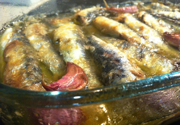 Enharinamos las sardinas y las freímos vuelta y vuelta con unos dientes de ajos , las ponemos en una fuente que pueda ir al fuego .