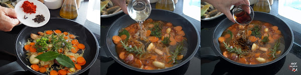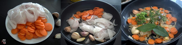 En un poco de aceite, rehogar la cebolla, los ajos enteros y la zanahoria. Añadir las hierbas aromáticas, tomillo, romero y laurel.