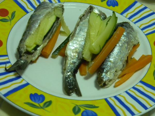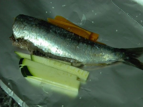 Pedimos al pescadero que nos limpie las sardinas, las salamos y las ponemos una a una sobre un trozo de papel de aluminio, acompañadas de unas tiras de calabacín y zanahoria que habremos cortado en tiras finas.