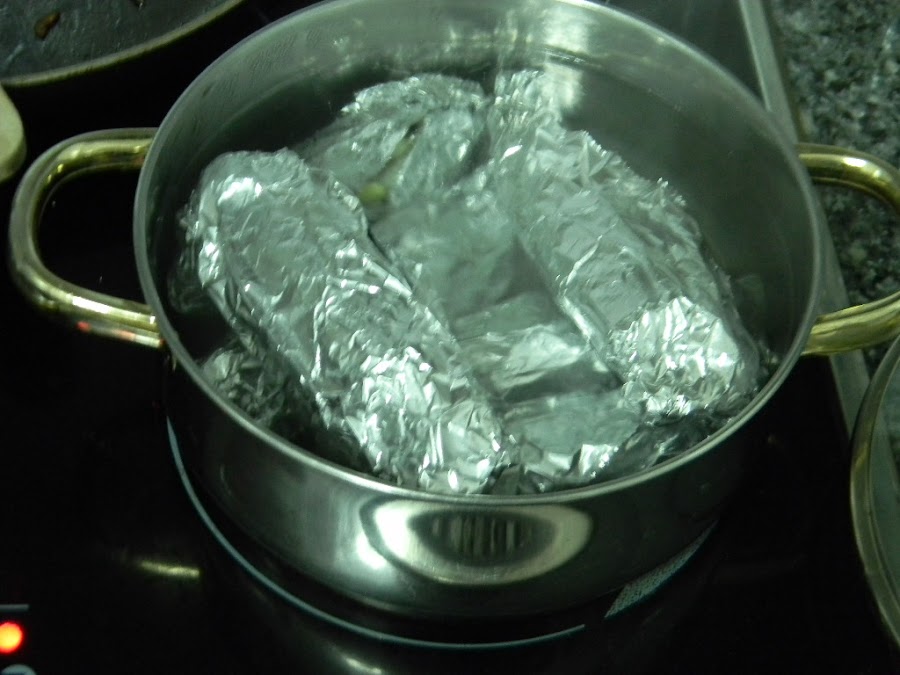 Cerramos el papel, con cuidado de que no se nos salgan los ingredientes, y llevamos a una olla con agua hirviendo, donde las dejaremos cinco minutos.
