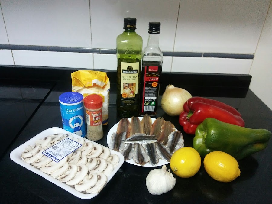 Lava las sardinas y riégalas con zumo de limón y espolvorea con sal. Corta las cebollas en aros, los pimientos y champiñones en tiras y pica los ajos. Enharina los filetes, sacúdelos para eliminar la harina sobrante. Fríe las sardinas en aceite durante unos 6 minutos, tres minutos por cada lado.