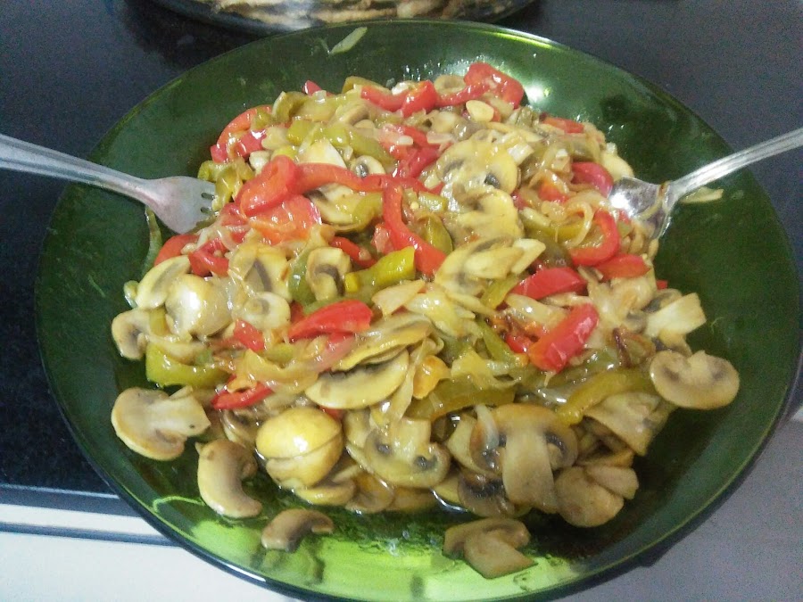 En el mismo aceite fríe los champiñones, retíralos y mezcla con los pimientos. Pone el aceite frito con 1/2 vaso más de aceite, el vinagre, la sal y la pimienta. Dispón las sardinas por capas en una fuente redonda. Reparte por encima el sofrito de cebolla y pimiento. Riega con la vinagreta, pon en el frigorífico y macera toda la noche.