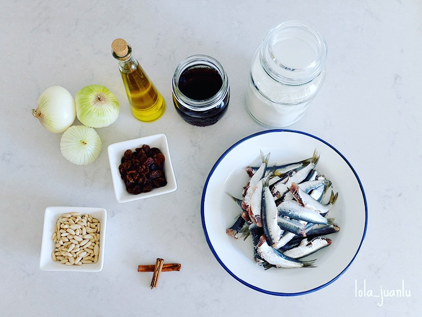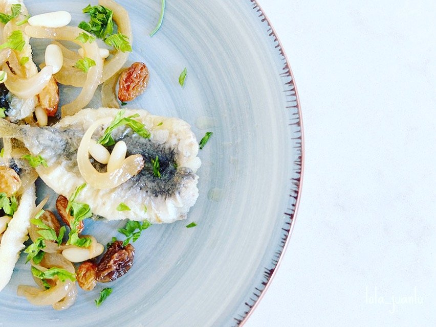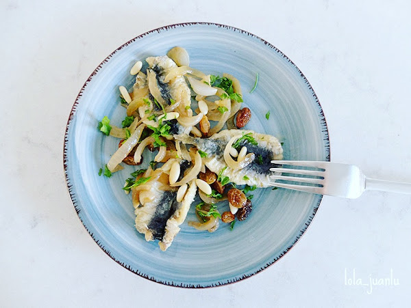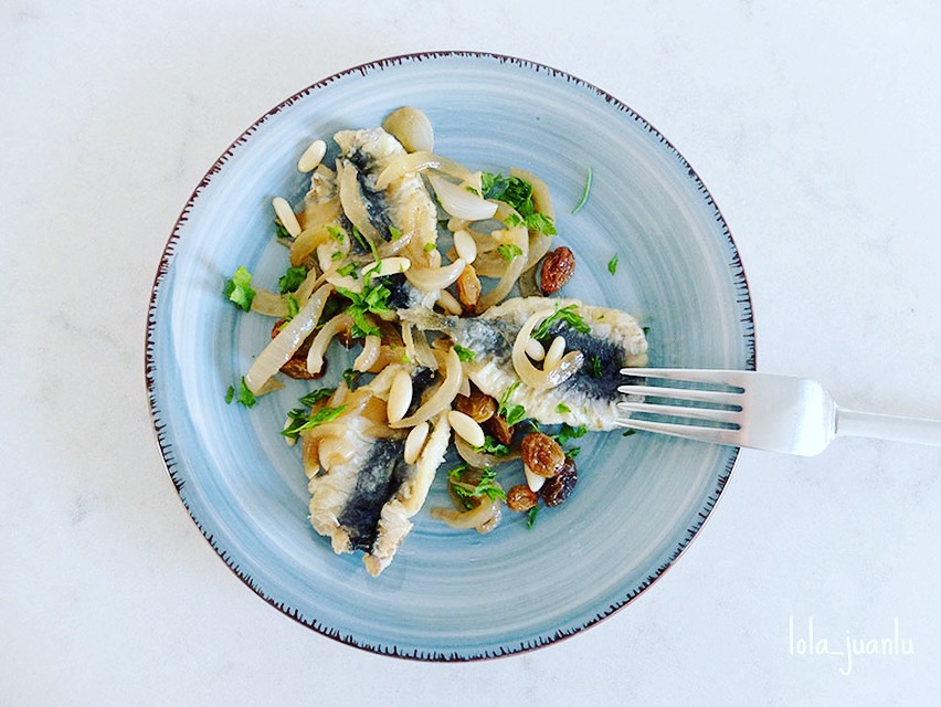 En un plato colocamos unas sardinas y las acompañamos con un poco de cebolla, pasas y piñones. Decoramos con un poco de perejil picado.