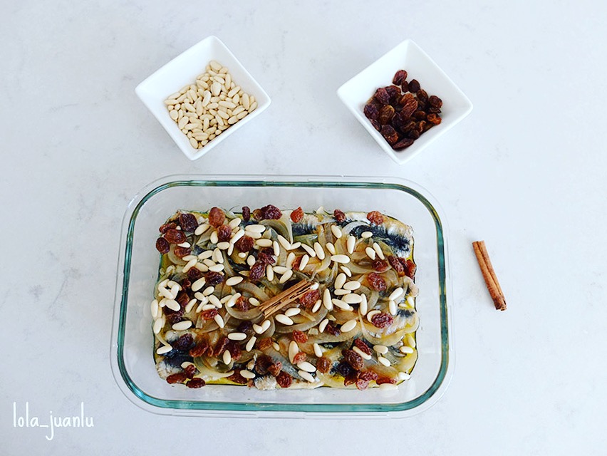 Si queremos añadirle pasas, piñones y canela, ahora es el momento. Y para finalizar, cubrimos con el líquido del marinado. Es importante que cubra las sardinas.