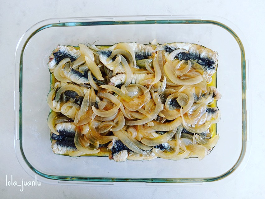 Comenzamos colocando una capa de sardinas y cubrimos con una capa de cebolla. Repetimos la operación hasta terminar con los ingredientes.