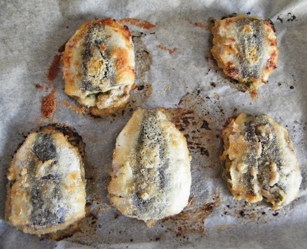 4. Colocamos 5 sardinas con la piel hacia abajo y sobre cada una echamos 2 cucharaditas del relleno. Cubrimos cada sardina con otra sardina, esta vez con la piel hacia arriba.