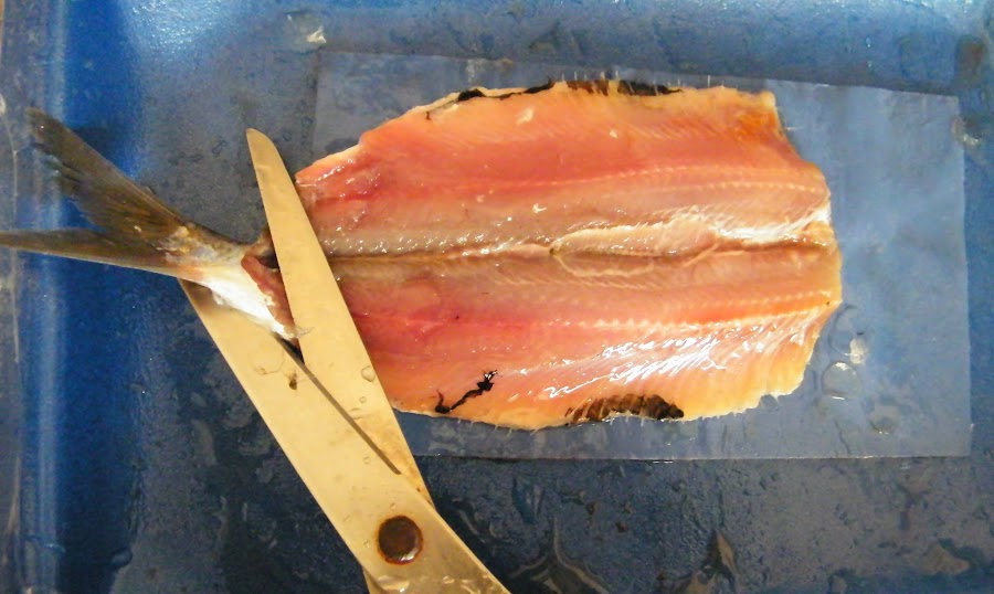 1. Si las vamos a limpiar nosotros, cortamos la cabeza y la cola con tijeras. Cortamos a lo largo del vientre y retiramos con los dedos las tripas y la raspa. Si las compramos ya limpias y abiertas, nos saltamos este paso.
