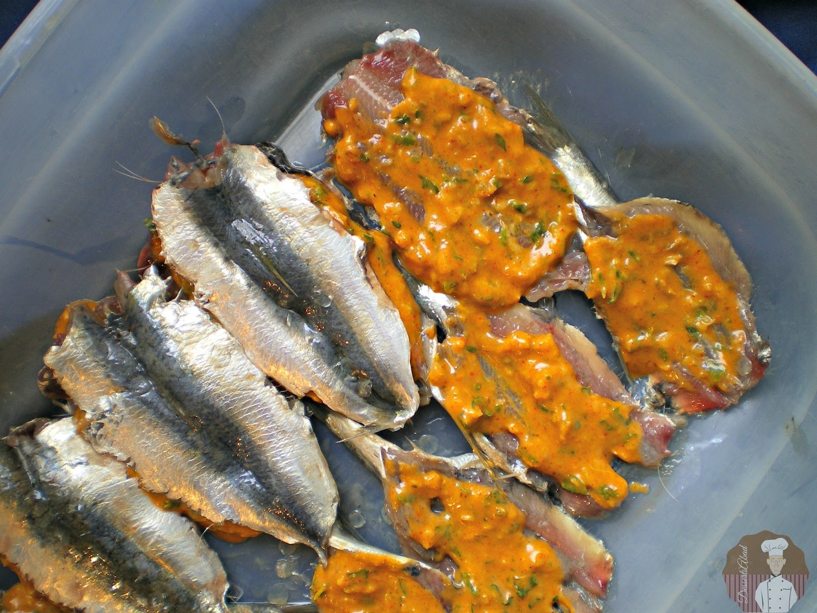 Disponer la mitad el pescado sobre una fuente grande o táper y extender la charmoula sobre los filetes de sardina. Tapamos con el resto de los filetes de sardina y dejar reposar en la nevera durante 2 horas.