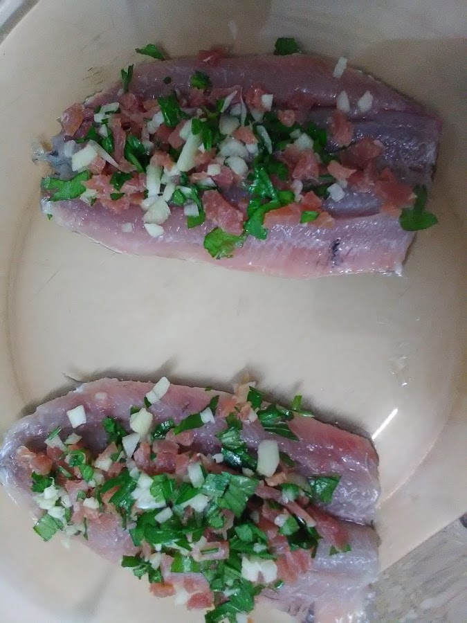 Si las sardinas son grandes puedes rellenarlas y doblarlas, si no, como es este caso, abre una sardina, cubre con la picada, y tapa con otra sardina.