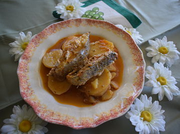 Pon a calentar aceite en el fondo de una cazuela. Pica la cebolla y pon a dora. Añade los ajos pelados y cortados en láminas junto con el tomate triturado previamente. Incorpora al momento el pimentón remueve cuidando que éste no se queme. Añade las patatas, y cúbrelas con el caldo de pescado reservado. Espolvorea el orégano.