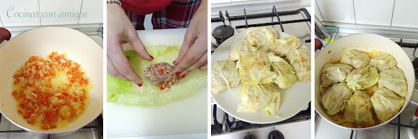 Ponemos a hervir una cazuela con abundante agua y con un chorro de limón, separamos las hojas más grandes de la col y las vamos cociendo de una en una sin pasarnos para que no se rompan, tienen que quedar tiernas.