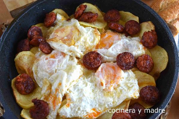 Dificultad: muy fácil Raciones: 4 personas Tiempo: 30 – 40 minutosIngredientes de la sartén de patatas huevos y chorizo: