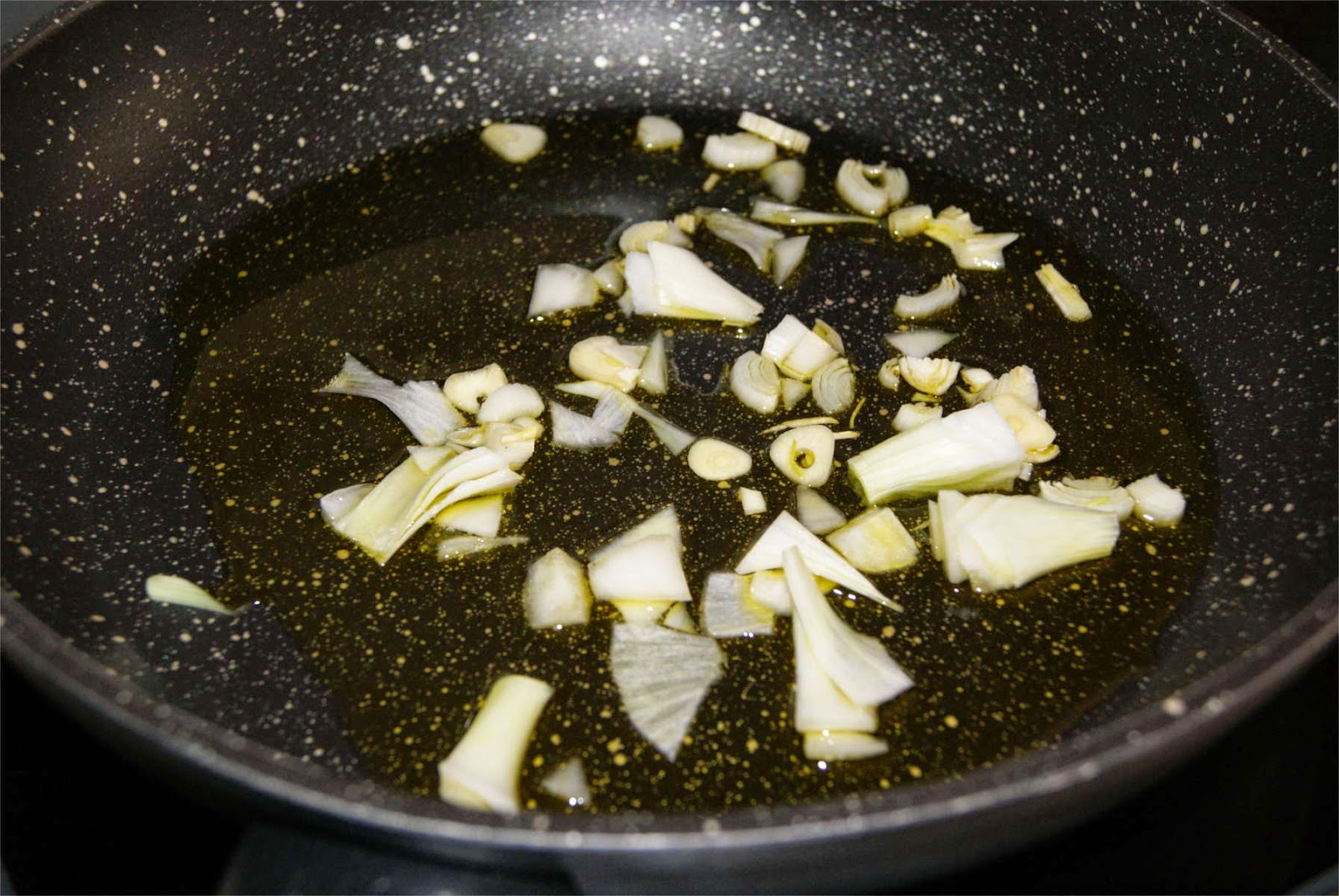 Ponemos a calentar una sartén con aceite. Pelamos el diente de ajo y lo fileteamos. Cortamos la cebolla y la ponemos junto con el ajo para que se dore con una pizca de sal.