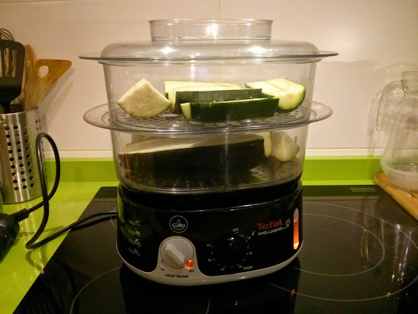 Cortamos la berenjena y el calabacín en trozos y los ponemos al vapor. Podéis hacerlo con un cocedor al vapor eléctrico o en una bandeja de cocción al vapor en microondas, si no tenéis ninguna de estas opciones, simplemente ponéis a hervir las verduras en un cazo como se ha hecho toda la vida. Es importante que no las hagáis mucho puesto que al pocharlas en la sartén se pueden deshacer y eso no nos interesa.