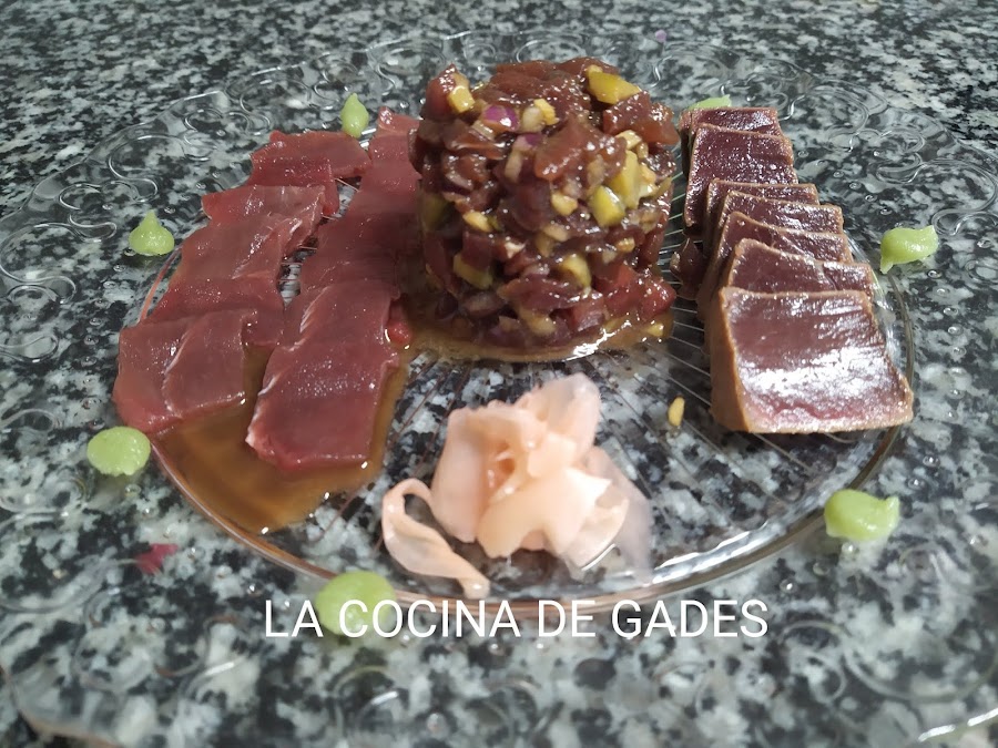 Para emplatar pondremos el sashimi, con la ayuda de un aro pondremos el tartar y el tataki, estas elaboraciones de atún lo acompañaremos con soja, wasabi y jengibre encurtido.