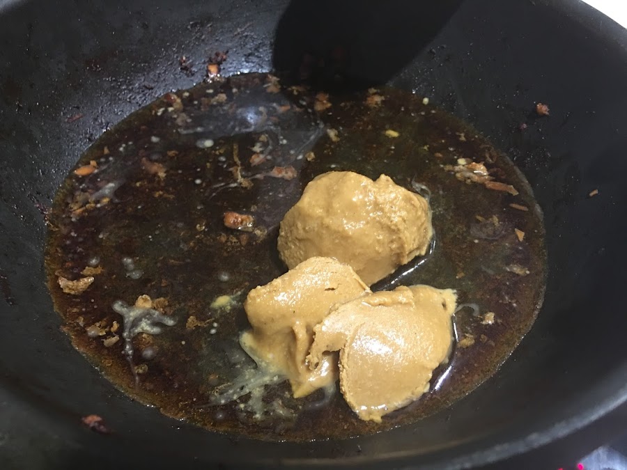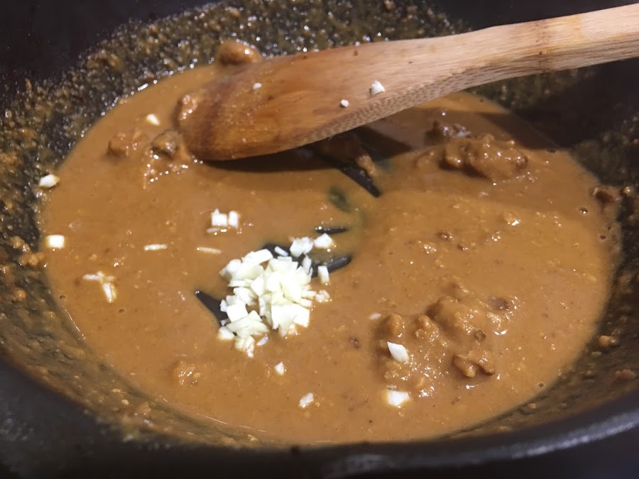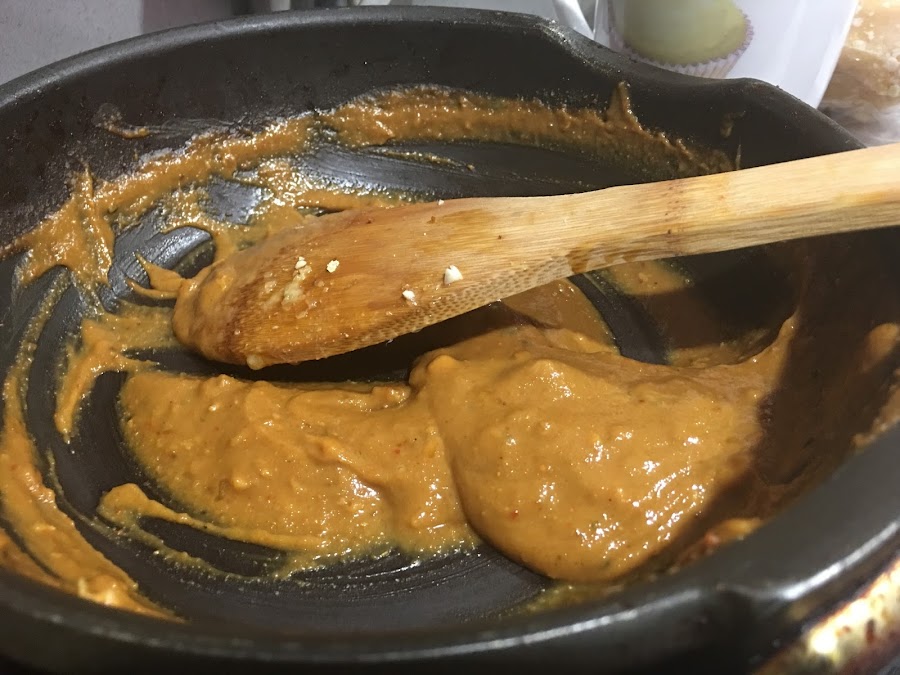 7. Para preparar la salsa añade la manteca de cacahuete y el agua en la misma sartén que has cocinado las brochetas. Mézclalo a fuego lento removiendo constantemente hasta que la manteca se disuelva.