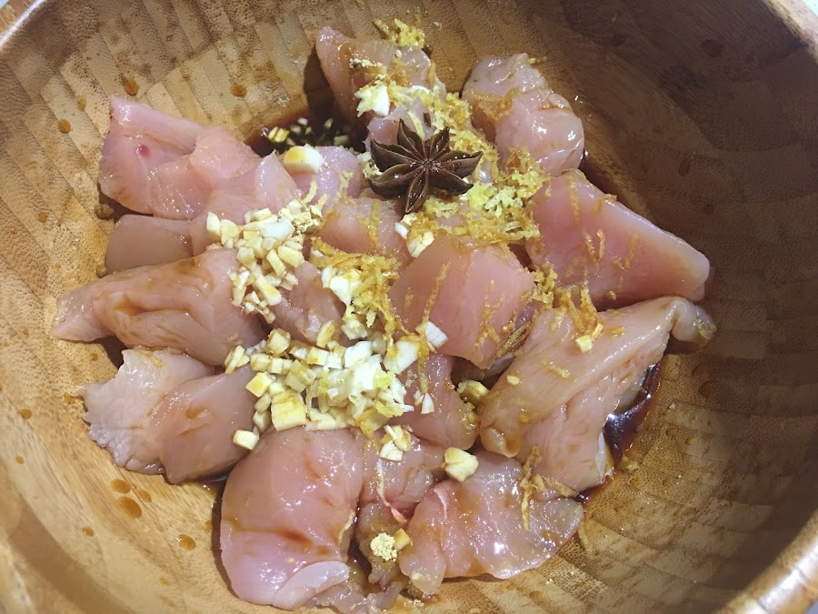 3. Coloca encima de la carne todos los ingredientes del adobo; el diente de ajo picadito, la salsa de soja clara, la ralladura de limón, el jengibre rallado, el anís estrellado y el zumo de manzana.