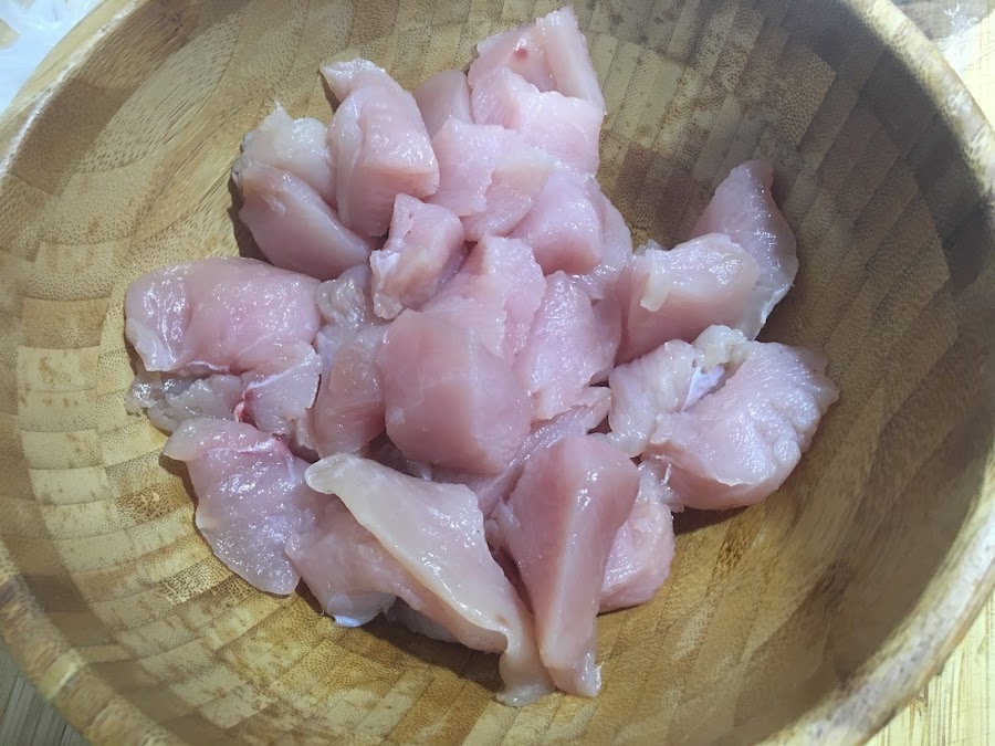 2.En un bol pon los 250g de pechuga cortada a dados. Para preparar esta receta la carne ideal es la de pollo o pavo, yo en esta ocasión me he decantado por la de pavo.