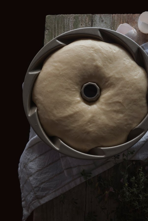 Horneamos a 180ºC (horno precalentado) durante unos 40-45 minutos. Si durante el horneado ves que se dora antes de tiempo, puedes colocar un trozo de papel de aluminio, pero hazlo rápido, pues lo último que queremos es que nuestro Savarin se baje, ya que no crecerá igual.