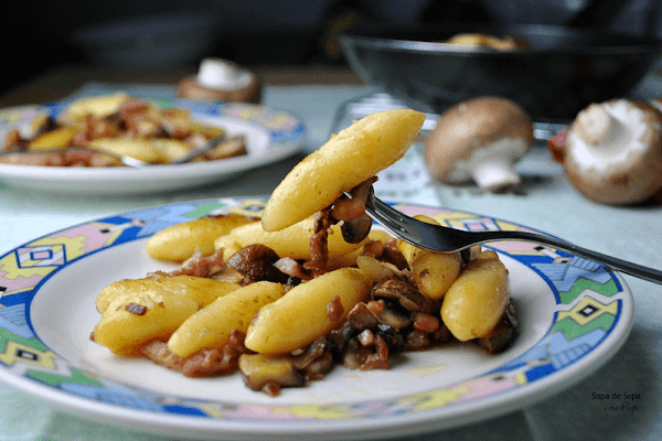 Añadir ahora los schupfnudeln y saltear todo los ingredientes hasta que tomen un bonito color dorado. Salpimentar. Vigilando que la panceta ya es salada.