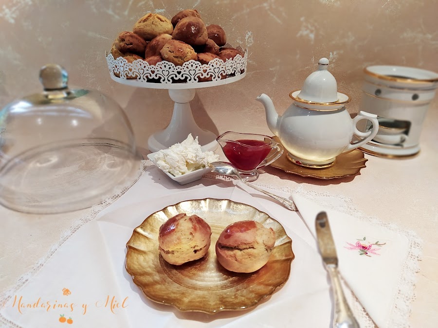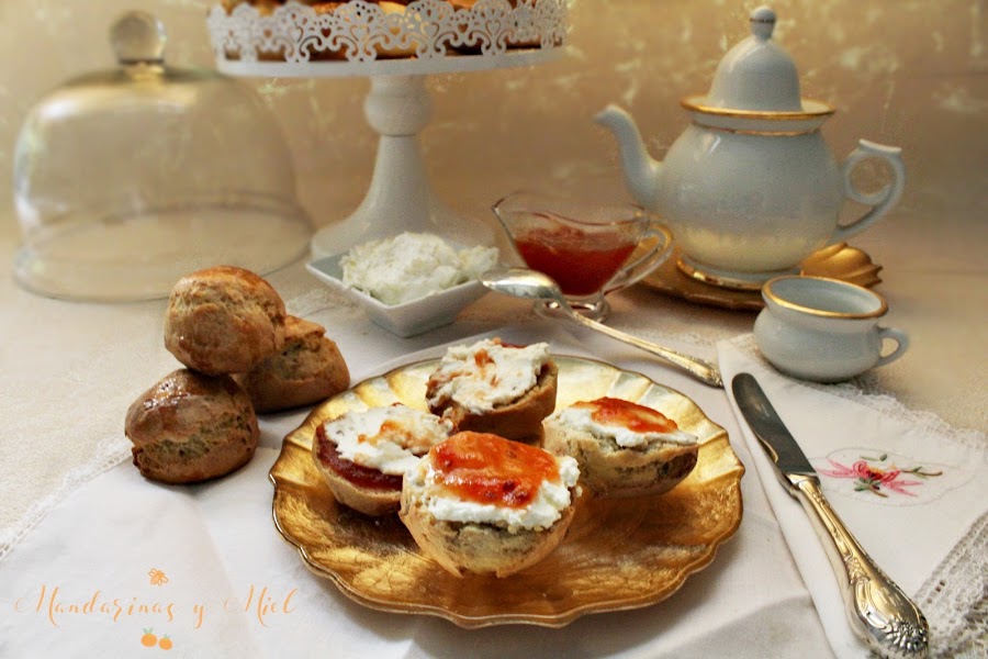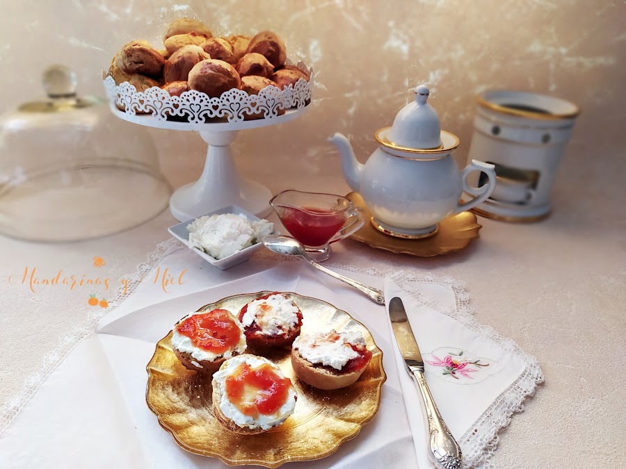 La Clotted Cream, que es la crema que se unta en los scones abiertos, se hace con una leche fresca de vaca que ellos utilizan. Como aquí es difícil de conseguir, se suele hacer en casa con queso Mascarpone y nata montada (crema de leche).